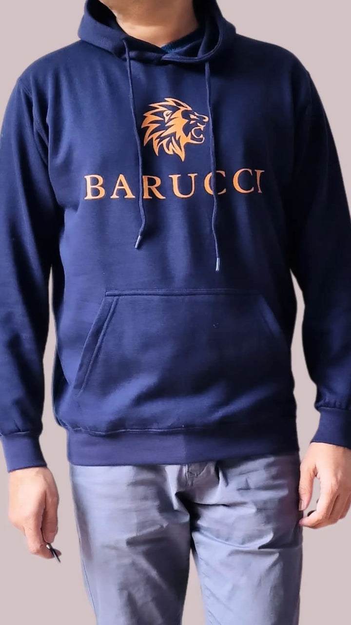 A Barucci Menswear design, the Joe Navy hoodie is tailored to a slim fit. This piece is crafted from a premium cotton blend cloth offering warmth and comfort. The signature red chest logo and the lionhead on sleeve deliver a signature finish, while the kangaroo pocket and ribbed trims complete the look. Joe was designed for the fashionable trendsetter. Joe is the perfect accessory to elevate any look. Throw on over an everyday outfit and make a statement of style. With effortless sophistication, this hoodie is designed for those who lead and stand out in the crowd.