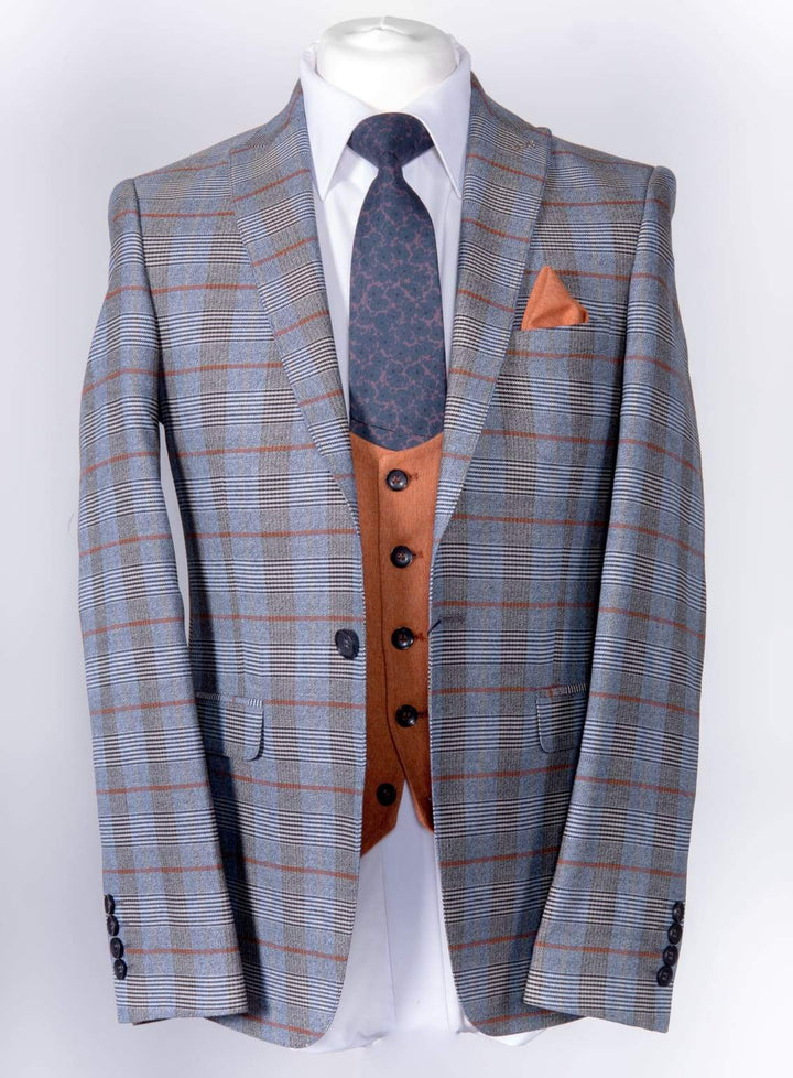 Wessi Men's 3 Piece Blue Orange Tweed Check Style Slim Fit Suit