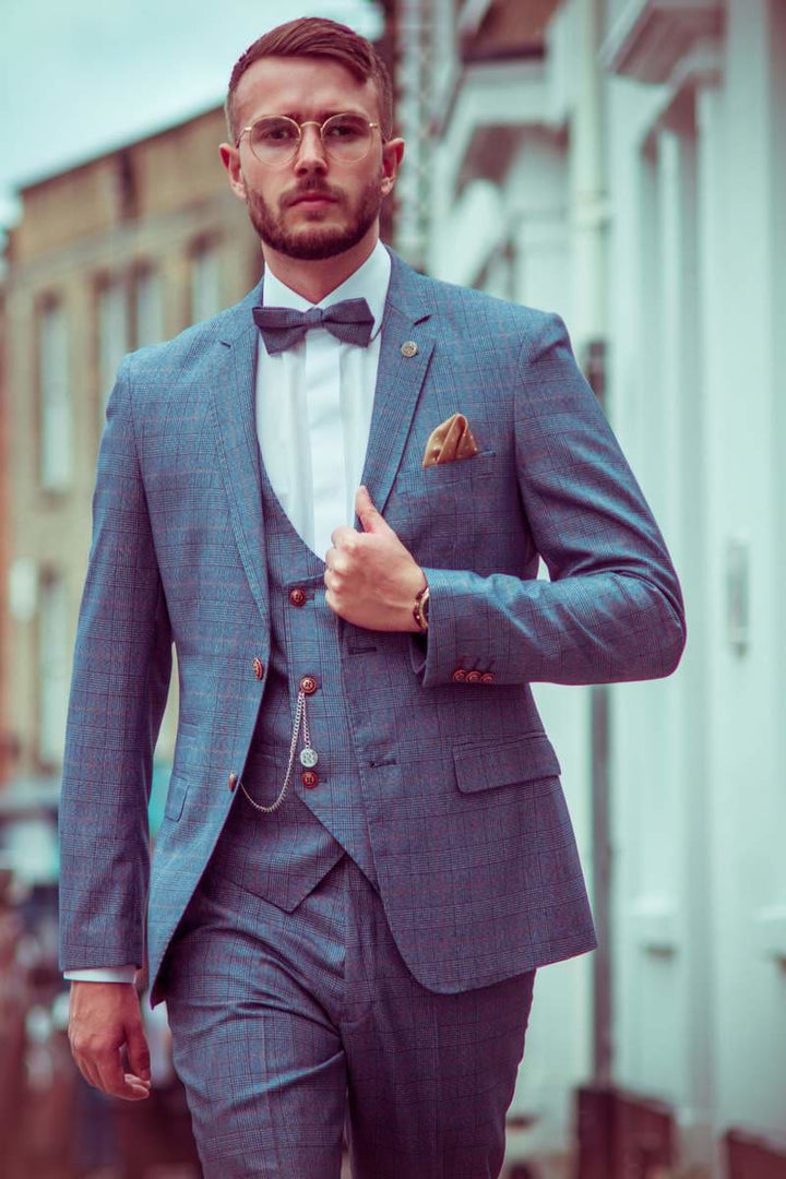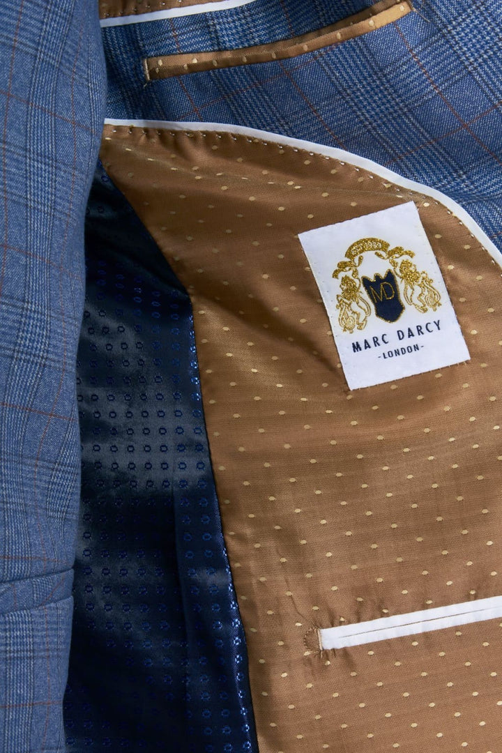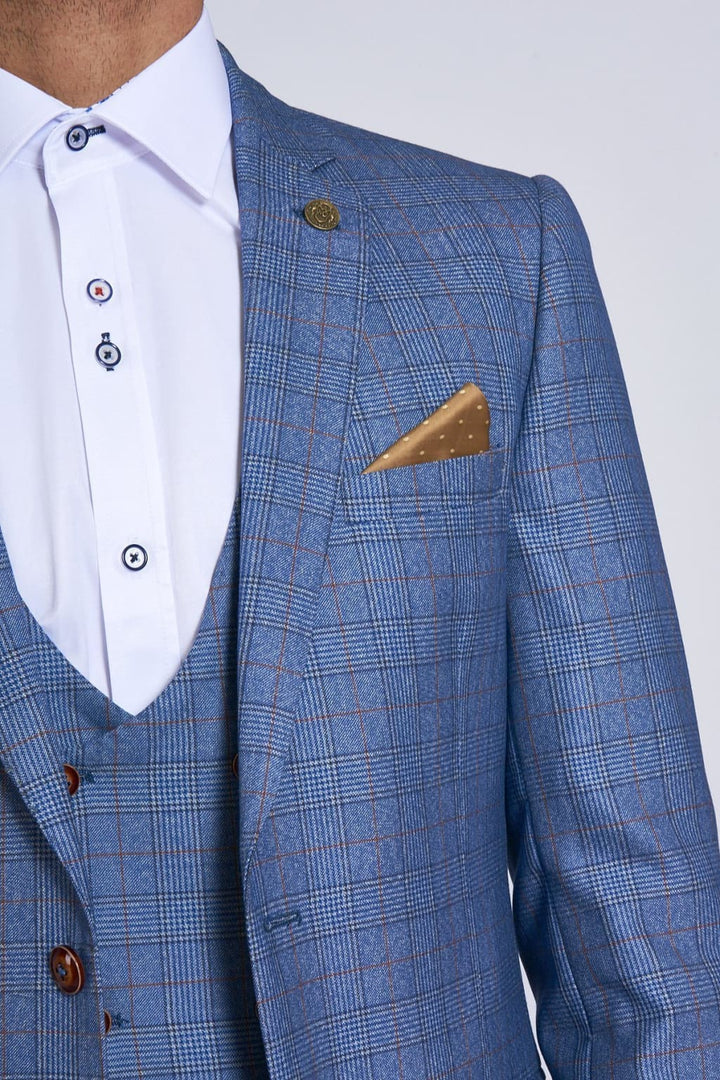 Marc Darcy George Light Blue Check Three Piece Suit Close up- menswearr.com