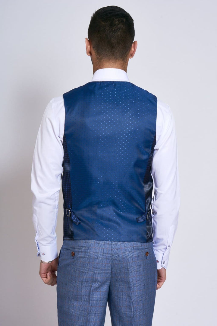Marc Darcy George Light Blue Check Three Piece Suit waistcoat back - Suit & Tailoring
