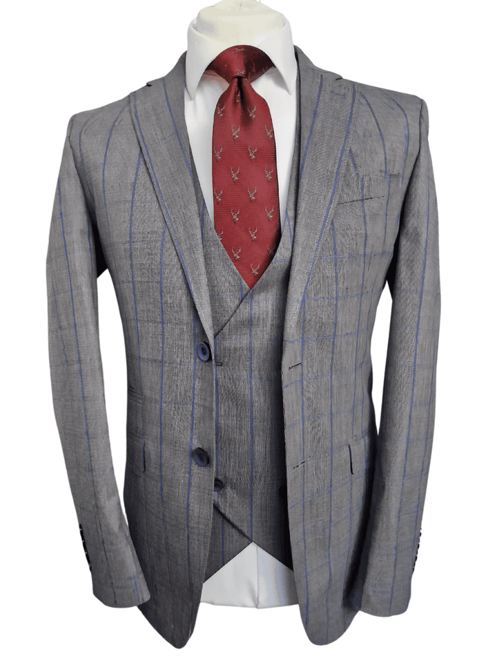 Be the best-dressed man at prom in this stylish grey check 3-piece suit! Crafted from a wool blend fabric, it features a slim fit design for a modern look. With only one piece left, don't miss your chance to look dapper in this timeless suit. Get it before it's gone!