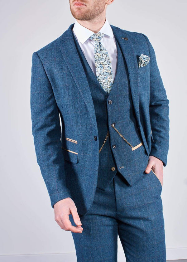 Marc Darcy Dion Teal Blue Tweed Slim Fit Wedding 3 Piece Suit