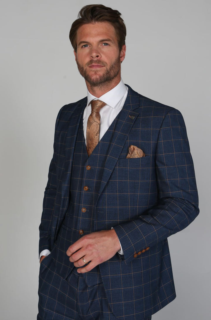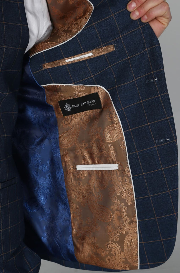 Offset the navy checked Blazer with a crisp white shirt and complete the look with the Paul Andrew golden brown paisley tie.