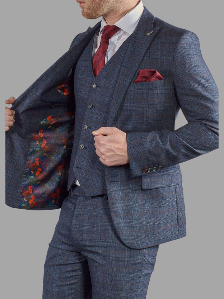 The Harry Brown Finley Navy Check 3 Piece Suit is perfect for vintage barn themed weddings, with a touch of modern British tailoring and an air of luxury. This suit is also versatile enough to be worn for business, graduation, and smart casual events, as well as formal occasions such as weddings. Crafted from 100% lightweight luxury wool, the navy base with rustic brown check adds a unique touch. The slim fit provides a sleek silhouette, while the beautiful lining adds to the overall quality of the suit. This distinguished choice from Harry Brown London is sure to impress, especially for a groomsmen suit. The current trend of check suits and the vintage navy/brown color combination make Finley an excellent choice for barn and vintage themed weddings.