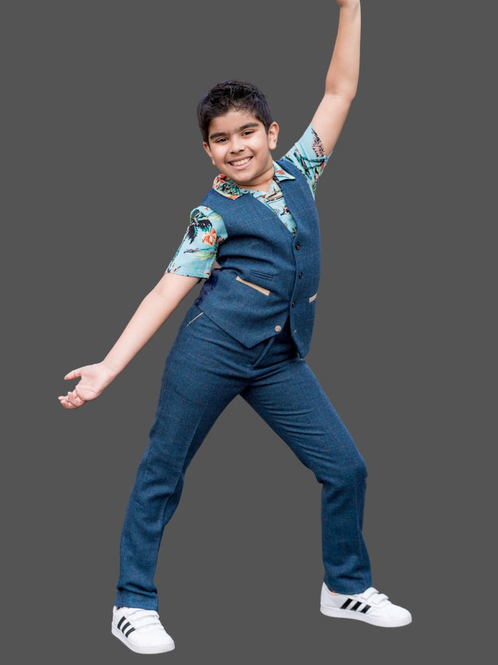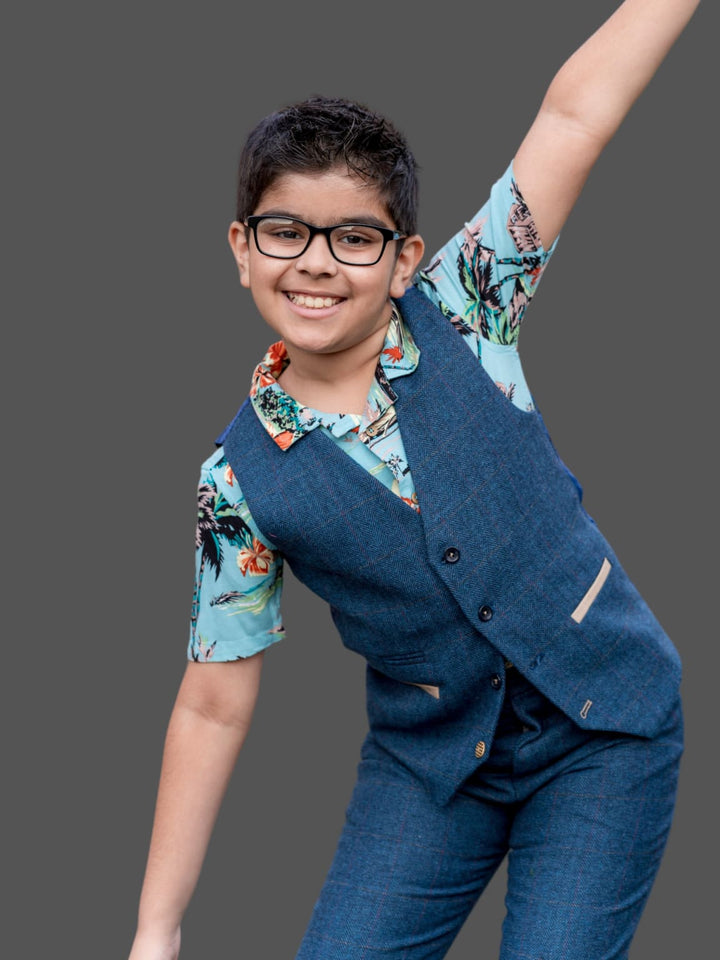 Leave them speechless with Marc Darcy's Dion Boy's Blue Tweed Check Three Piece Suit- the perfect integration of the past, present, and future. This carefully designed suit brings you and your little one closer, with you showing him traits of your childhood, and him having a glimpse of adulthood. Wear it on your most special occasions, as it's not an everyday suit! Make sure he stands out in the crowd, and leaves heads turning with this timeless classic. Let him experience the best of past, present, and future fashion in this ultra-cool three-piece suit. Wear it to those special occasions for a look that's sure to last the test of time - and give everyone something to talk about!