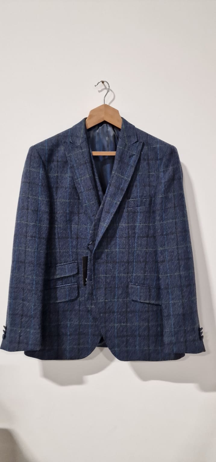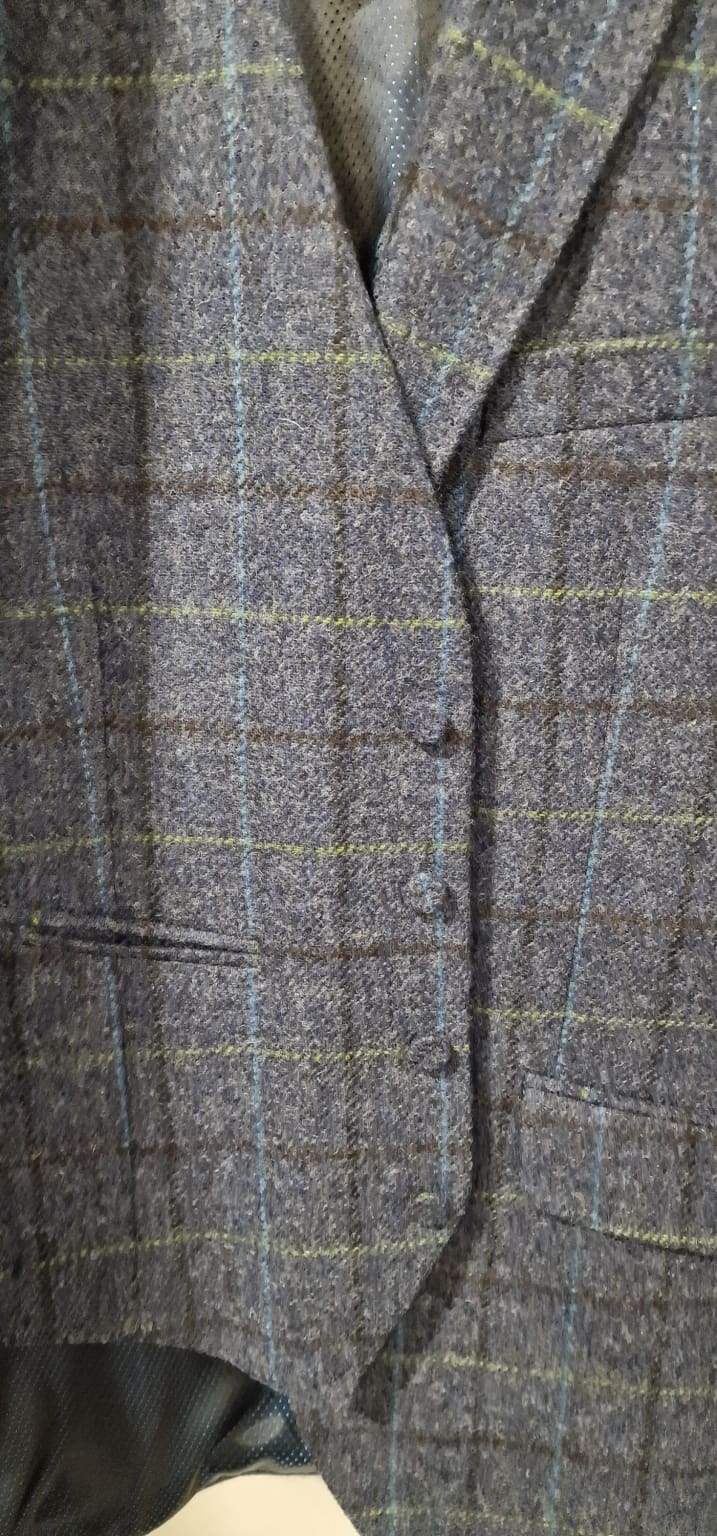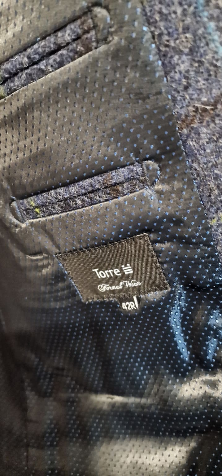 Indulge in ultimate luxury with the Torre British Pure Wool Tweed 3 Piece Navy Check Suit. Crafted from the finest pure wool tweed, this suit exudes timeless elegance and sophistication. The detailed navy check pattern adds a touch of distinction, while the size 44R jacket and 38R trousers provide a perfect fit. Elevate your wardrobe with this exclusive suit.