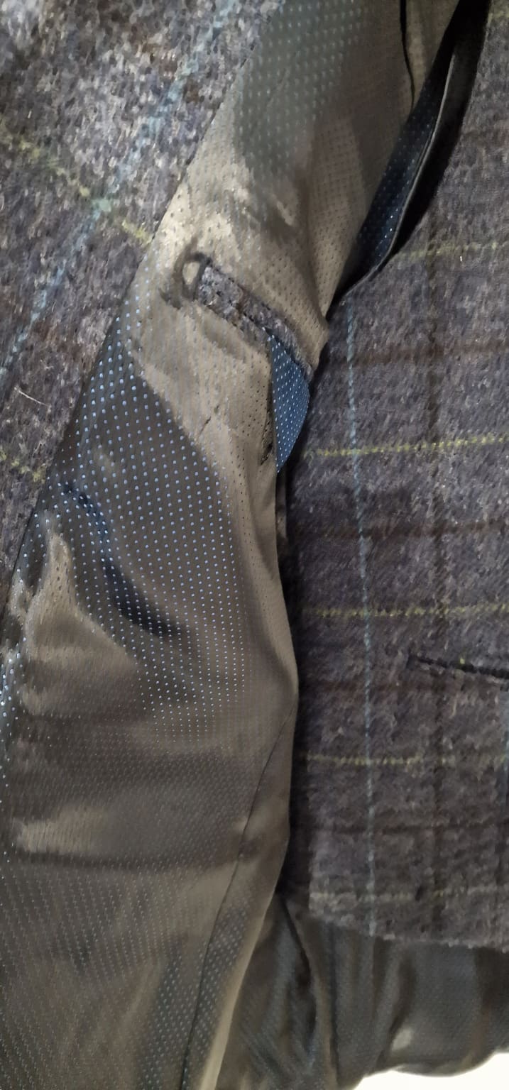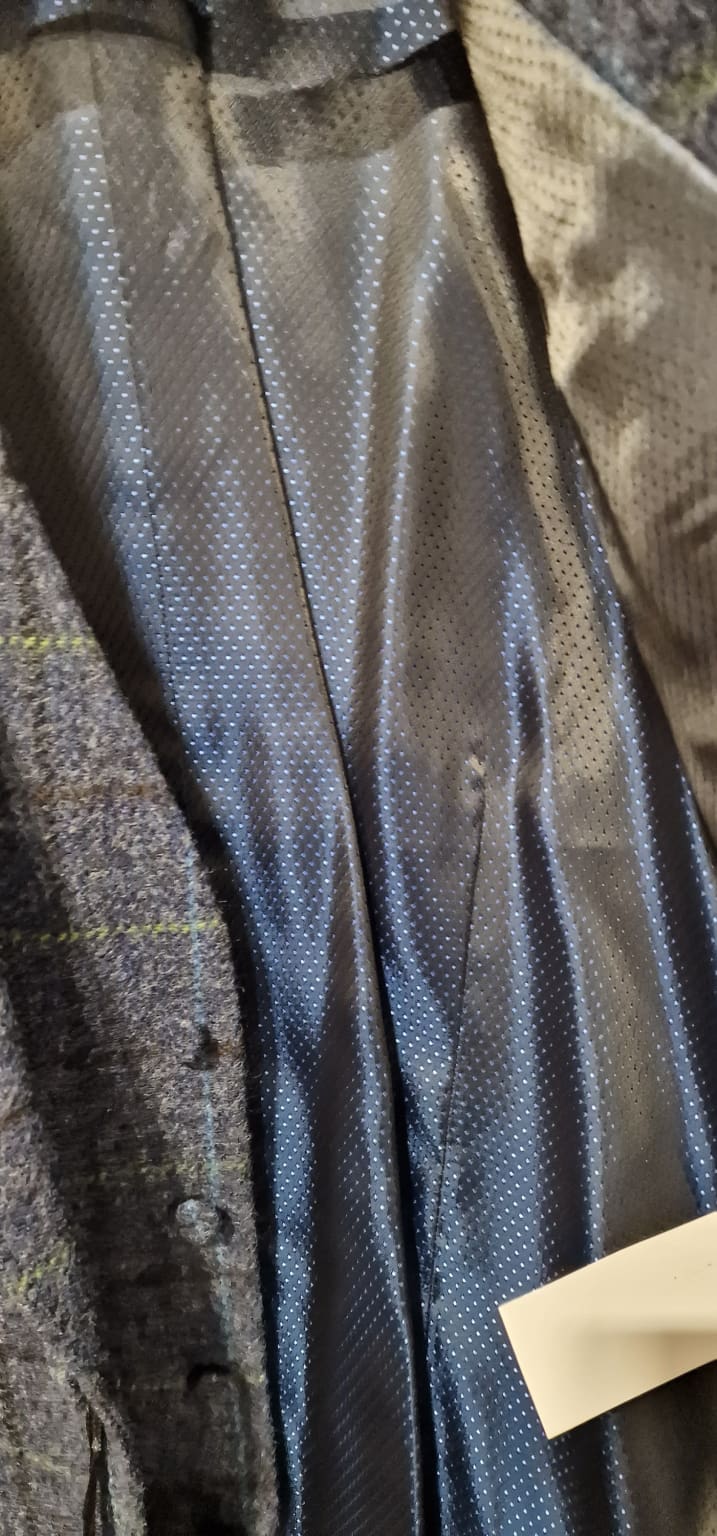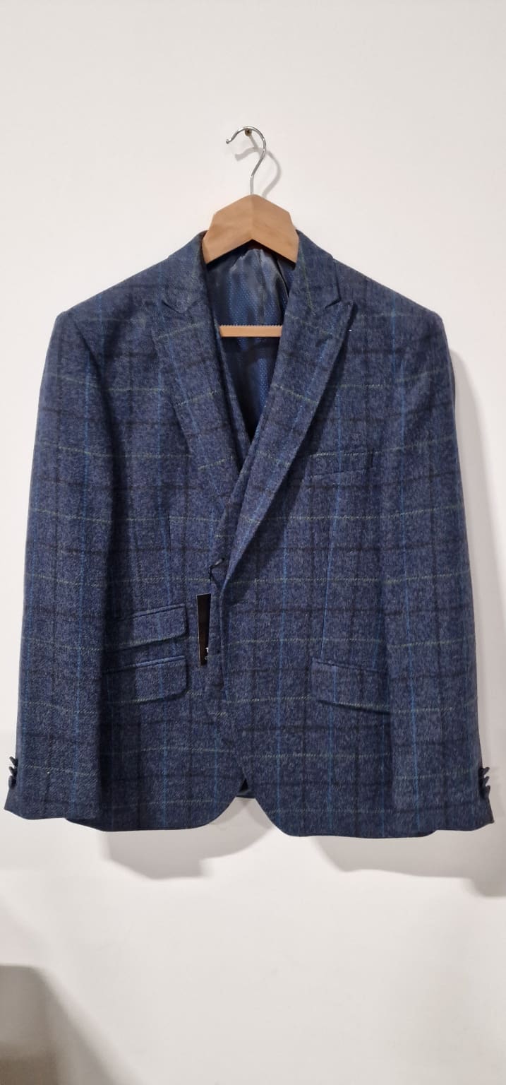 Indulge in ultimate luxury with the Torre British Pure Wool Tweed 3 Piece Navy Check Suit. Crafted from the finest pure wool tweed, this suit exudes timeless elegance and sophistication. The detailed navy check pattern adds a touch of distinction, while the size 44R jacket and 38R trousers provide a perfect fit. Elevate your wardrobe with this exclusive suit.