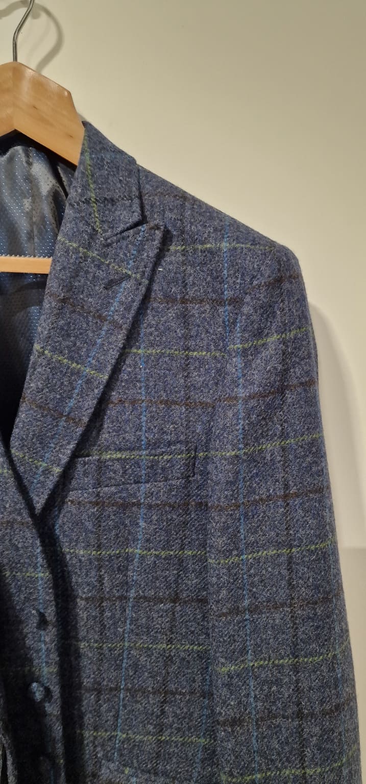 Torre British Pure Wool Tweed 3 Piece Navy Check Suit Size 42R with 36R Trousers - Suits