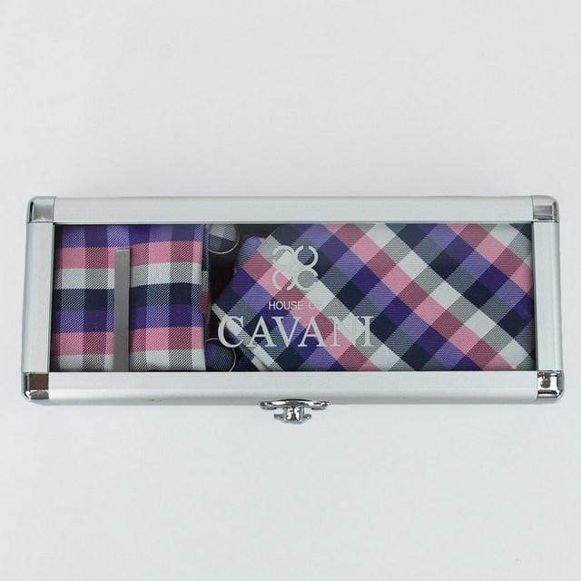 Elevate your suit game with this luxurious tie and pocket square set from Cavani, boasting a blend of sophistication and vibrant hues. Made with plush polyester, the 7.5cm wide tie exudes a professional aura, while the pocket square adds a refined touch with its contemporary twist on traditional white polka dots. A sleek tie pin adds the perfect finishing touch, and the coordinating cufflinks add an extra touch of elegant coordination. Complete the ensemble with a crisp white shirt and a navy or olive green windowpane check or stripe suit for a classic, yet eye-catching look that is sure to garner compliments. Arrives in a stunning and timeless gift box.