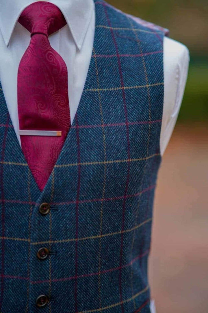 Skopes Doyle Navy Herringbone Check Tweed Suit Waistcoat Want Something new yet sharp and elegant for your wedding day? Check out the New Doyle Blue Herringbone Overcheck Tweed Waistcoat. With Burgundy...