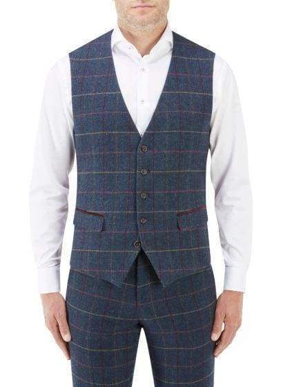Doyle Suit Waistcoat in Navy Herringbone Fabrin with Aqua / Wine Check. Single breasted five button fastening waistcoat. Features include lower flap waist pockets, geometric print lining and adjustable back strap. See matching Doyle jacket, tailored trousers and tapered trousers.