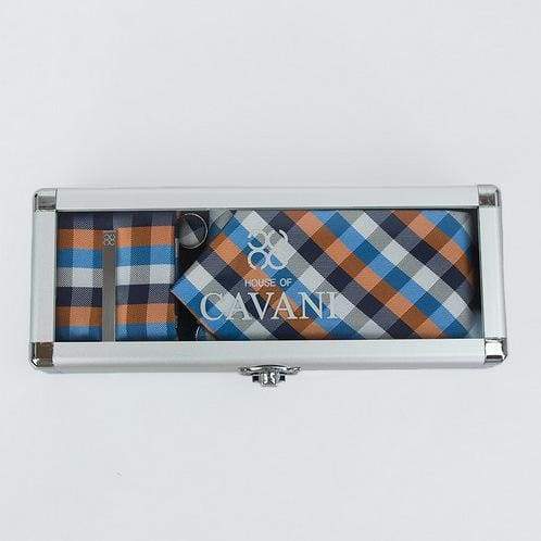 Cavani Orange Check Stripe Tie Set in Gift Box   This exquisite tie and pocket square set from Cavani elevates your suiting accessories with its striking combination of luxury and...