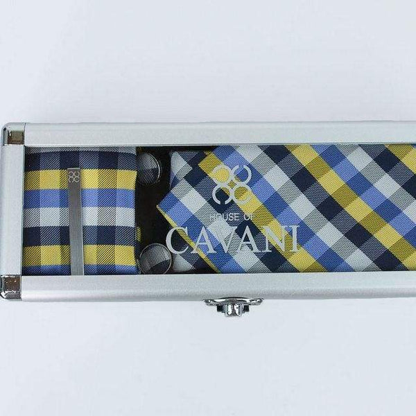 Cavani Yellow Check Tie Set in Gift Box   Upgrade your suiting accessories with this luxurious tie and pocket square set from Cavani. Made with high-quality polyester, the 7.5cm width...