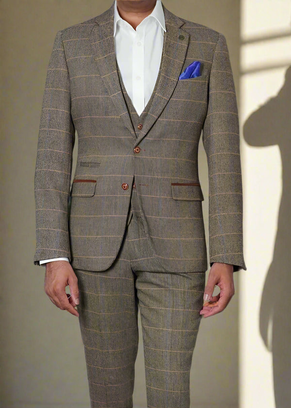 Marc Darcy Ted Men's 3 Piece Tan Slim Fit Tweed Suit