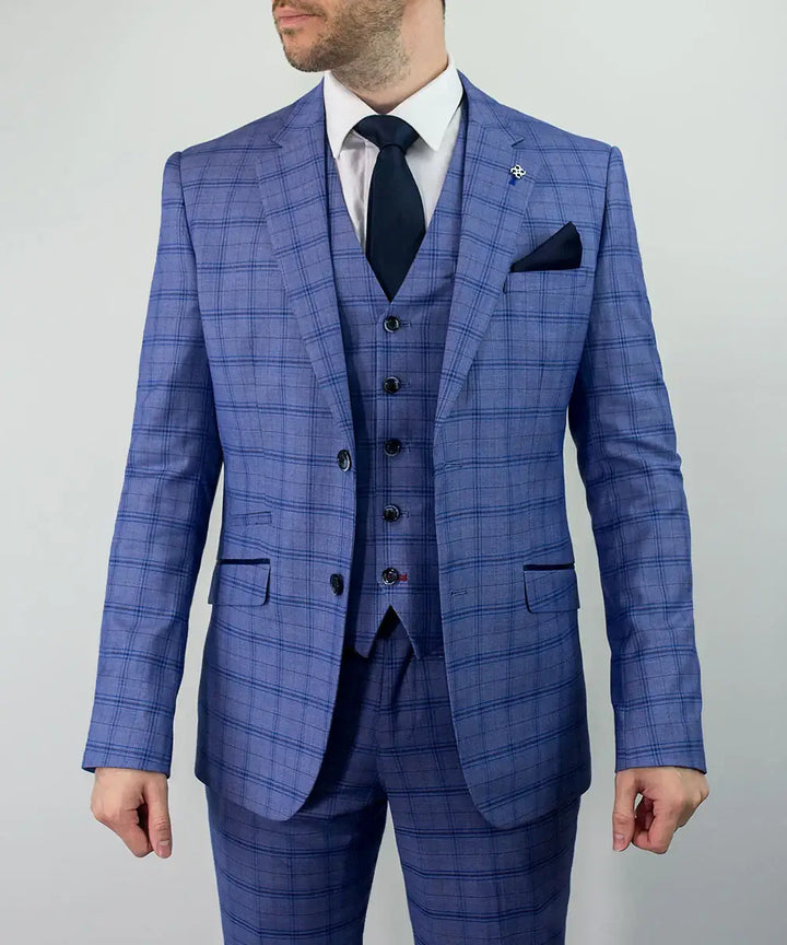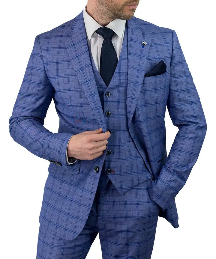 Cavani Tamara Blue Check Tailored Fit 3-Piece Suit Size 36R with 32R Trousers   Finish off your ensemble with timeless check trousers. The Cavani Tamara Blue Check Slim Fit Trousers exude...