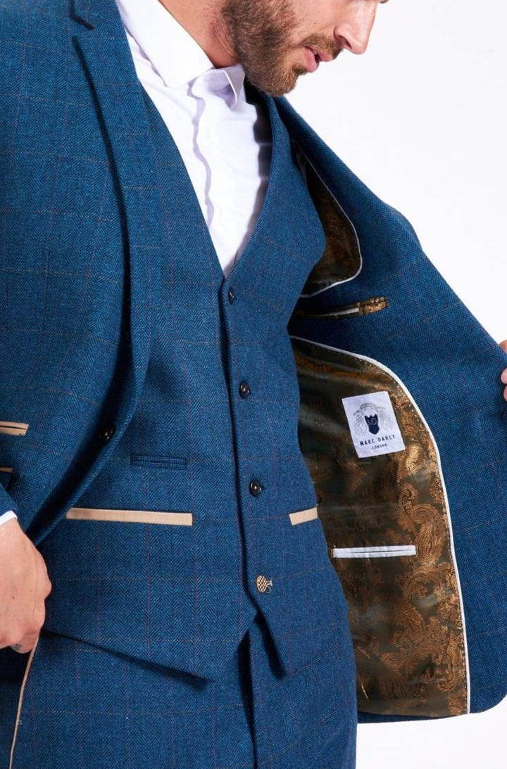 Rock Marc Darcy's Dion Mens Blue Tweed Blazer for a modern urban edge. This daring blue hue dares you to dress it up or down. Show off your style with four cuff buttons and single breasted cut. The perfect choice for summer weddings, its luxury paisley print lining will have you looking sharp as ever when paired with its waistcoat and white shirt. Take the risk and be a head-turner!
