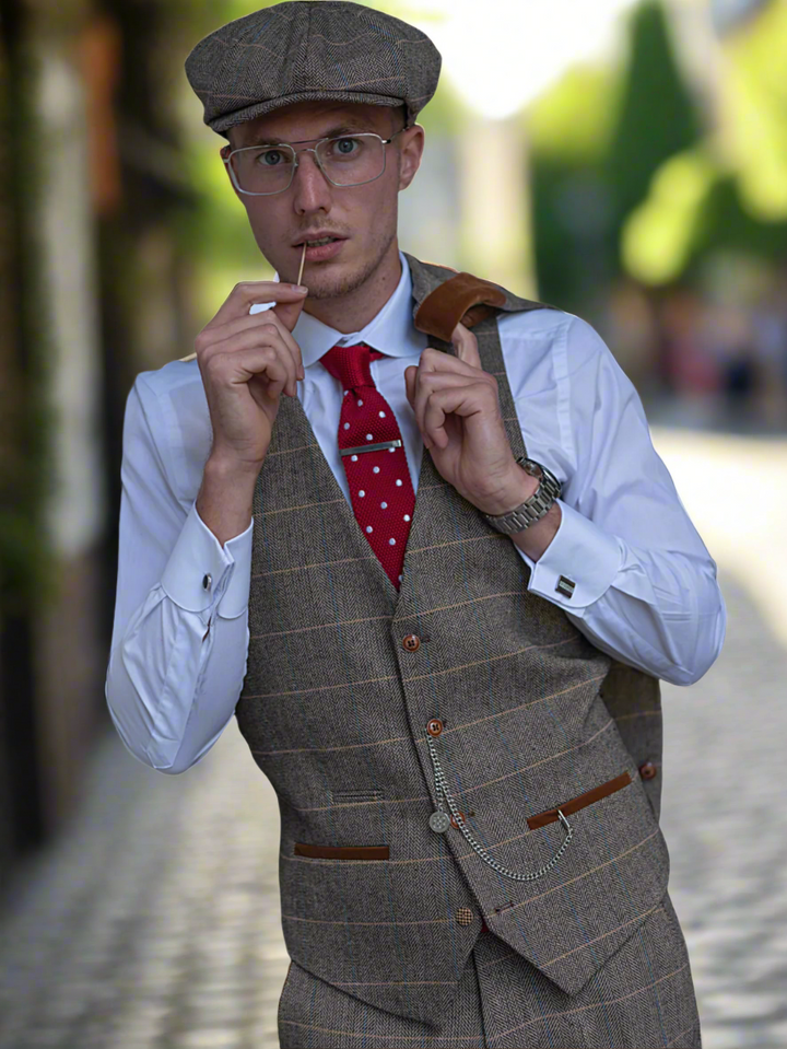 Marc Darcy Ted Tan Tweed Herringbone Check Waistcoat - 34R
