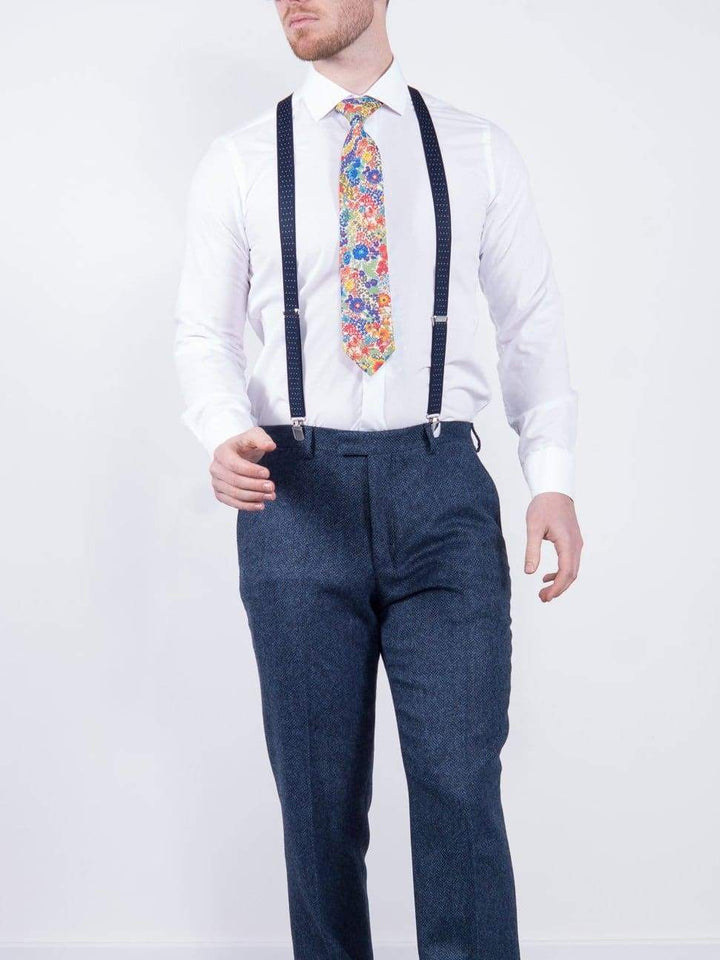 Made  of 100% Pure British Wool by Torre UK. Torre Devon Blue British Wool Herringbone Tweed Trousers are made with a light weight fabric that makes it easy to wear on a summer wedding day. Half lined in the front,  they stay comfortable for longer wears.