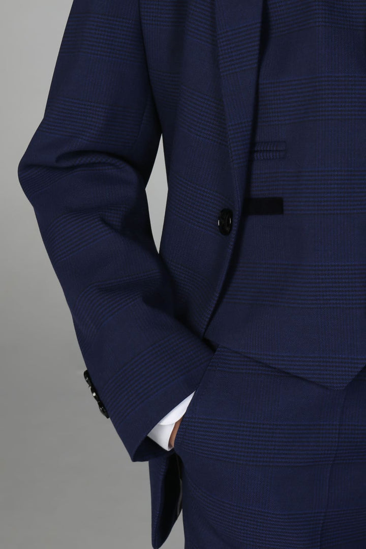 Featuring a bold red and navy lining, the suit provides a striking contrast that complements the blue check pattern, adding an extra layer of refinement. Perfect for special occasions, the Mark Blue suit ensures both comfort and a sharp, polished appearance.