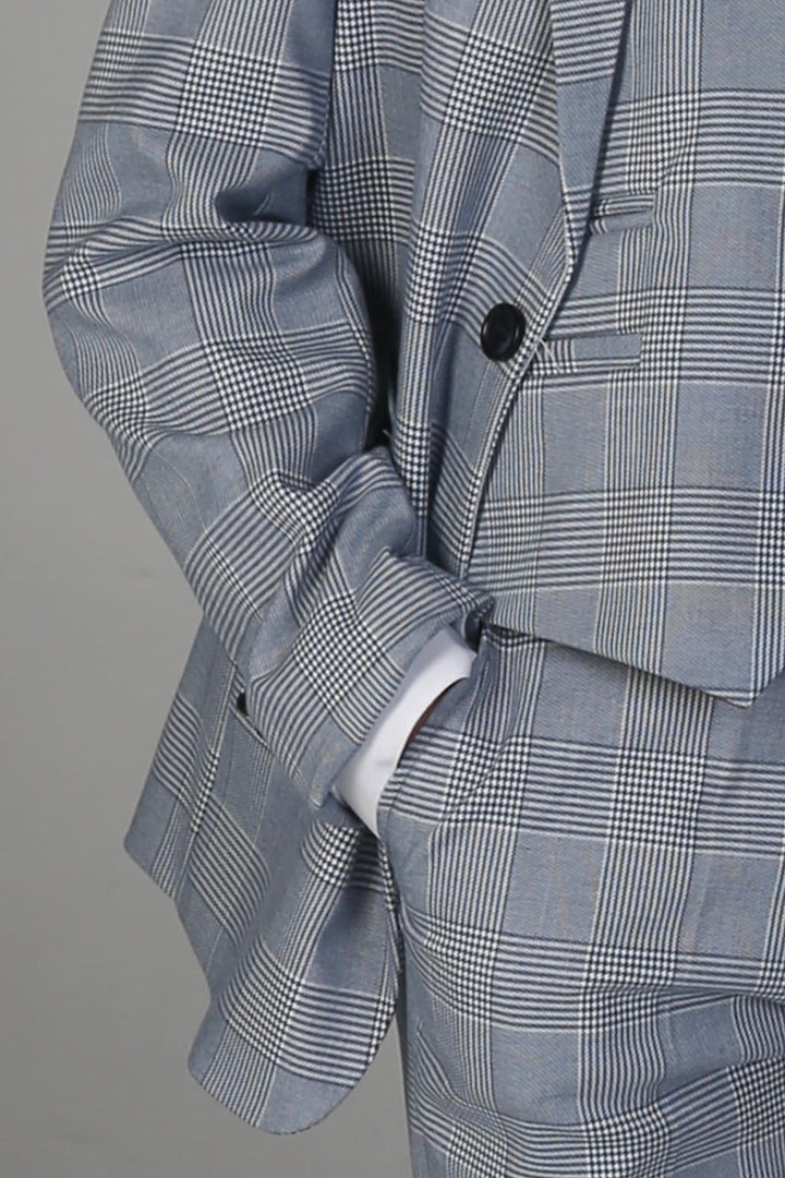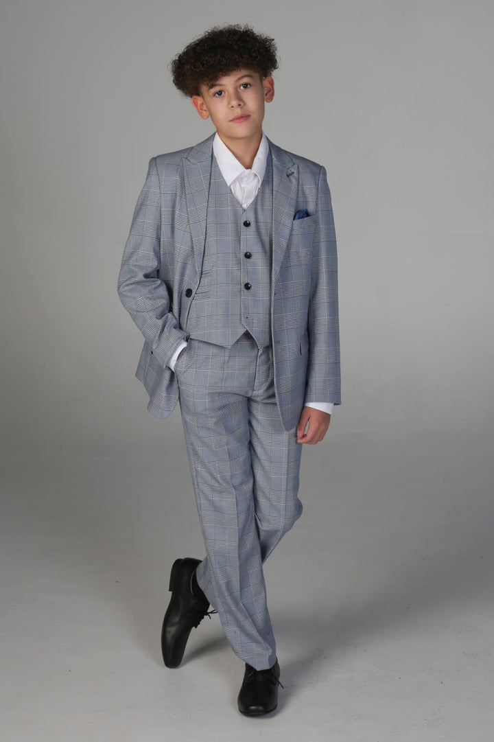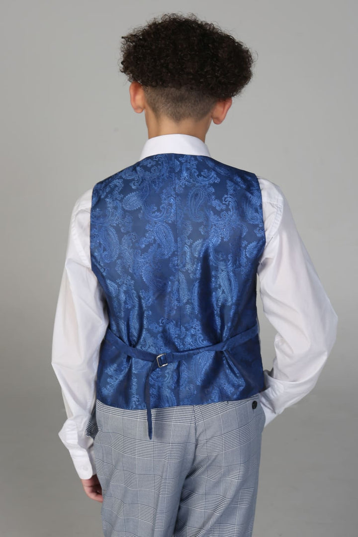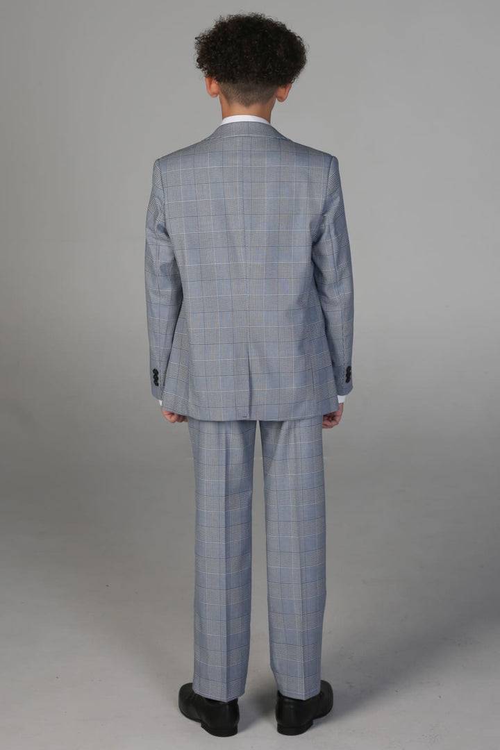 The Mark Sky Blue Boys' Checked Three-Piece Suit by Paul Andrew combines classic sophistication with a modern edge. Crafted from vibrant blue checked fabric, this suit includes a blazer, waistcoat, and trousers designed to make a stylish impression.