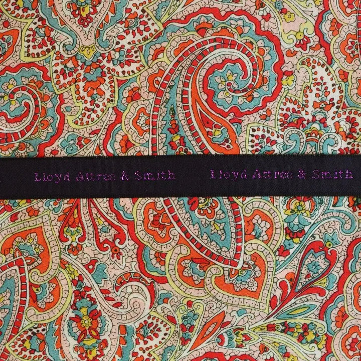 This Orange Hank Made With Liberty Fabric by L A Smith is perfect for weddings and other formal occasions. The hank is It's quite versatile and can be used to dress up your look or complement a more casual style. The hank has a textured look and several off-white diagonal lines, giving it interest.