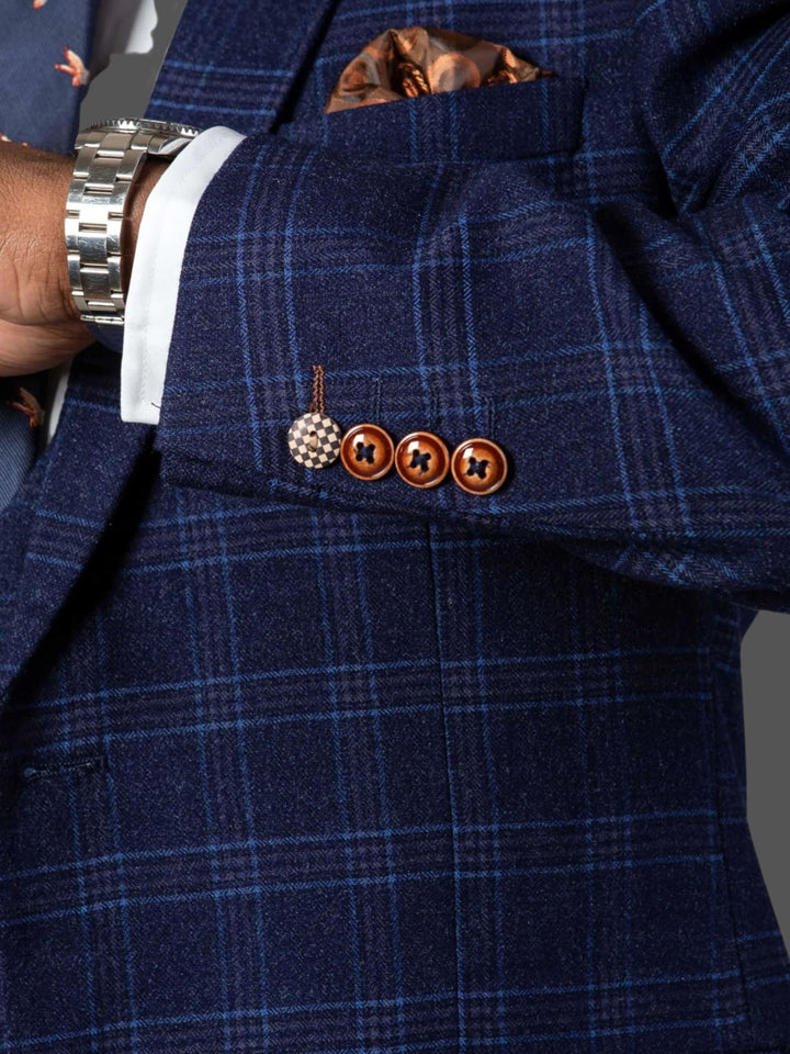 Marc Darcy Chigwell Men's Blue Tweed Check Three Piece Suit with tan buttons